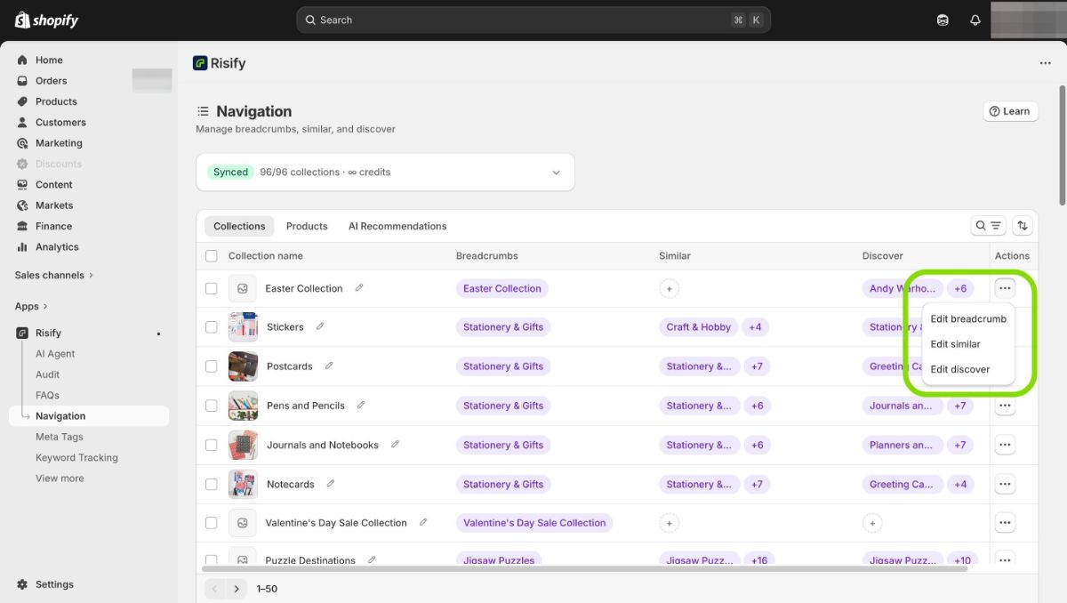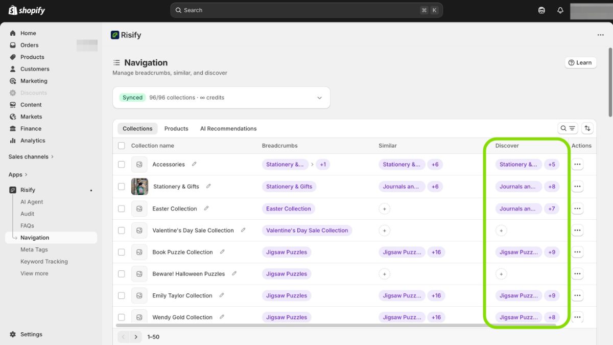 Note: Discover (Collection Menu) is managed under the Navigation tab in Risify , alongside the Breadcrumbs and Similar features.