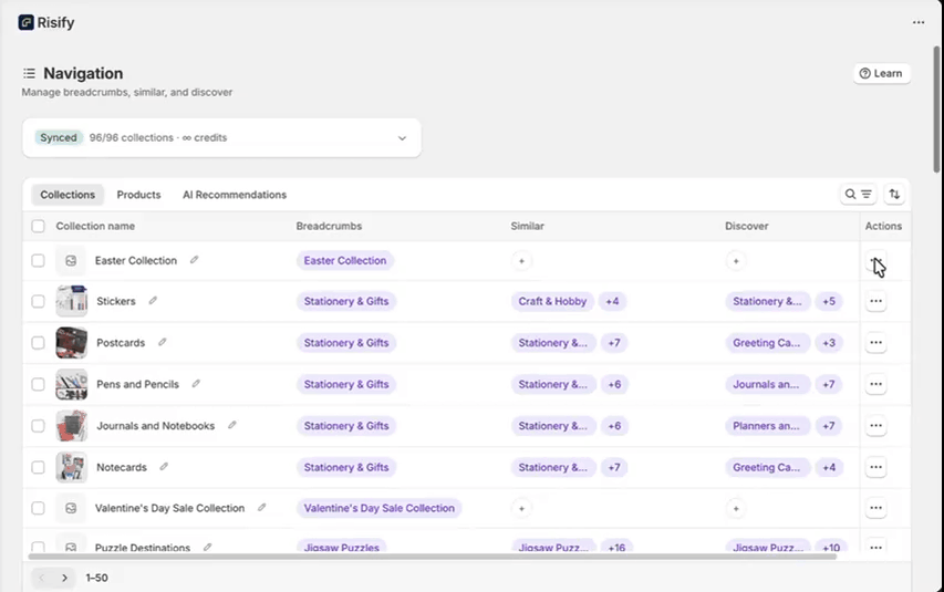 In your Shopify admin, go to Apps, open Risify, and click Navigation. Go to the Collections tab. You will see a Discover (Collection Menu) column that shows which collections already have suggestions configured.