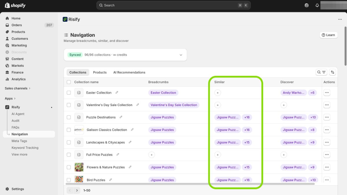 Note: Similar is managed under the Navigation tab in Risify , alongside the Breadcrumbs and Discover features.
