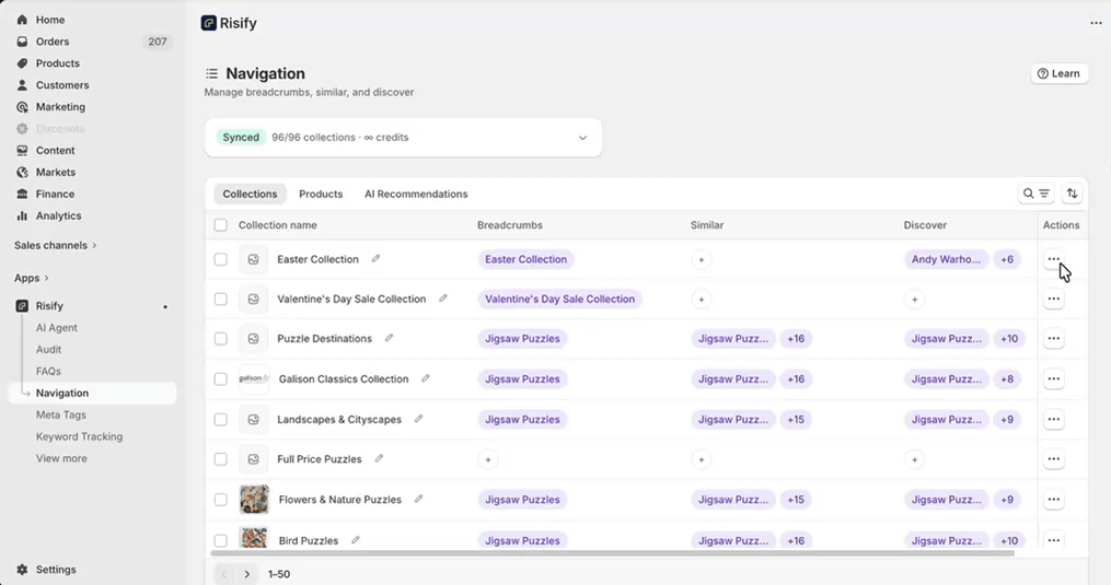In your Shopify admin, go to Apps, open Risify, and click Navigation. Go to the Collections tab. You will see a Similar column that shows whether each collection already has a Similar menu configured.